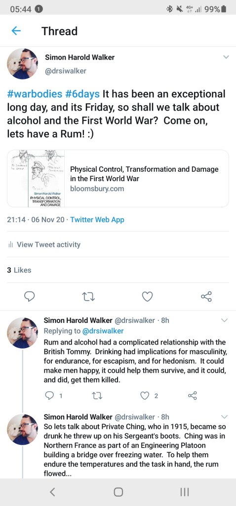 War Stories – on my twitter I have been sharing daily short accounts from my books on the key themes of the text. Follow, like, and share my account to find out more about the men who caused muntinies, were punished for being ill, or got so drunk they were left tied to a temporary bridge as 10,000 troops marched passed them. #warbodies