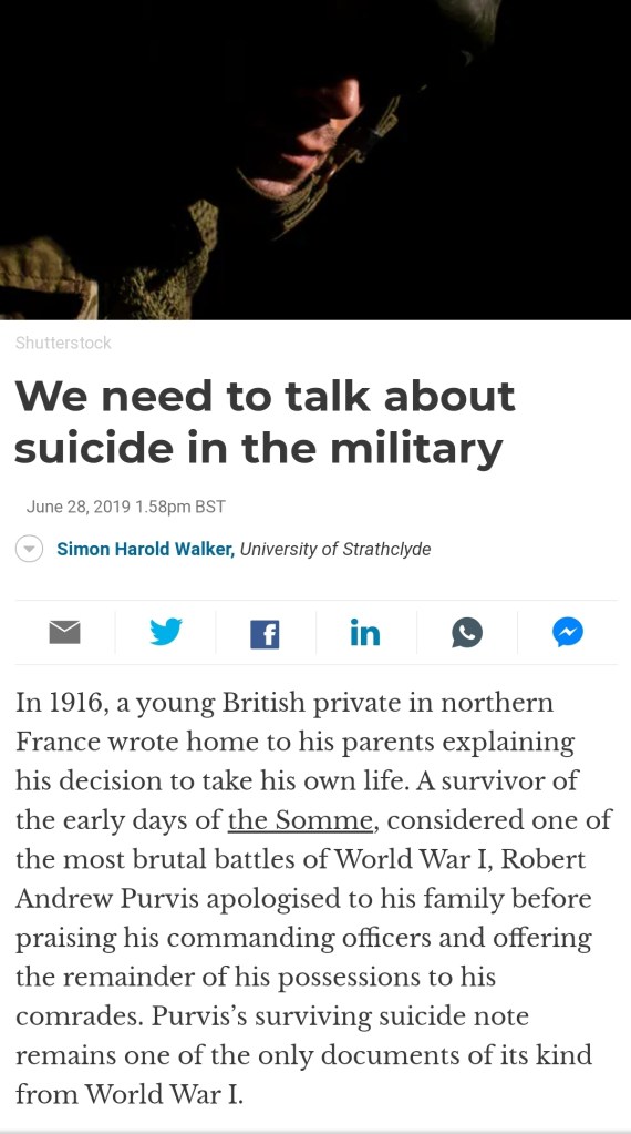 Companion Article: The Conversation and Remembrance Day – As a joint piece for my book and for the armistice day I have written a short article on the lasting implications of war within the Conversation. This will be released on Sunday the 8th of November and shared here and on social media. In the meantime click below to read my previous articles on military history and suicide.