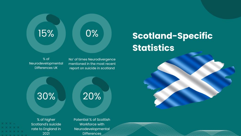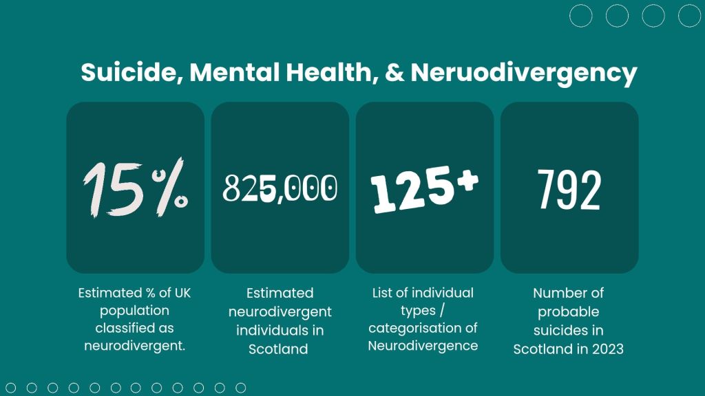In the UK, an estimated 15-20% of the population is neurodivergent, translating to roughly 825,000 individuals in Scotland alone (Mental Health Foundation, 2023). Scotland has a suicide rate about 15% higher than England’s, with 792 probable suicides recorded in 2023 (National Records of Scotland, 2023). However, we don’t have reliable data linking neurodivergent status to suicide cases. The absence of this data hampers our ability to craft policies and interventions that could potentially save lives. We must advocate for suicide tracking that includes neurodivergent identifiers, enabling us to understand and address this intersection of risk more effectively.