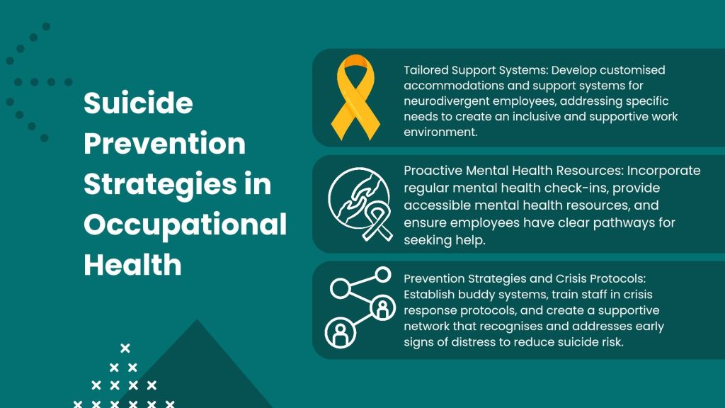Occupational health plays a unique role in reducing suicide risk. Proactive assessments and workplace accommodations—such as sensory-friendly environments or flexible schedules—could provide neurodivergent employees with the stability they need to thrive. Research by Autistica (2018) highlights that tailored workplace adjustments can significantly decrease suicide risk by reducing stress factors that impact neurodivergent individuals more severely than their neurotypical peers. It’s clear that an investment in inclusive occupational health practices is also an investment in suicide prevention.