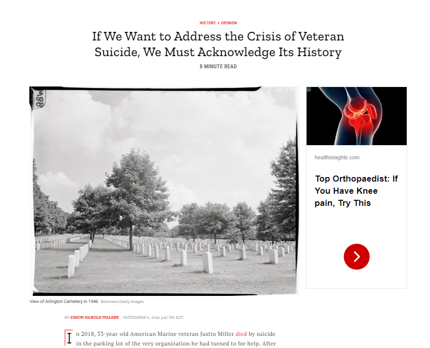 - Walker, S. (2019). “If We Want to Address the Crisis of Veteran Suicide, We Must Acknowledge Its History.”, Time Magazine, Accessible at https://time.com/5670036/veteran-suicide-history/